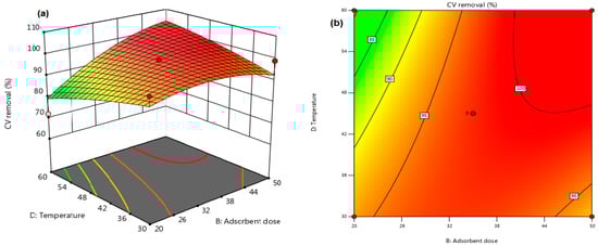 Table 3 was used to assess the significance of the interactions between the independent variables. The results showed that the interaction influence between adsorbent dosage (B) and temperature (D) had a statistically considerable impact on CV removal efficiency, with a p-value of 0.0477. The other variables, namely a 25% Cel loading, a pH of 10, and a 5 min contact time, remained constant throughout the experiment. The interaction between the adsorbent dose and the temperature was further analyzed using 3D and 2D response surface plots, as shown in Figure 8a,b, respectively. The plots indicated that augmenting the adsorbent dose from 0.02 g to 0.05 g led to higher CV dye removal (%), possibly due to increased active adsorption sites or available surface area. Nevertheless, the temperature seemed to possess no significant influence on eliminating CV dye, suggesting an exothermic adsorption process. These results will be discussed further in Section 3.7 on Adsorption Thermodynamics.
