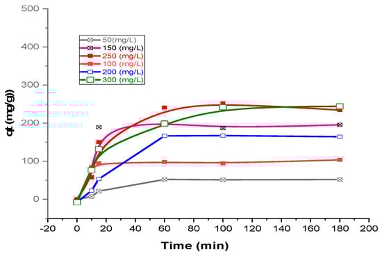 In this work, the influence of residence period vs. initial CV level on the adsorption potential of Kaol/Cel–25 was explored over a range of initial levels from 50 to 300 mg/L. Figure 9 shows the experimental results, while the optimal conditions for CV dye removal were determined based on the highest achieved CV dye removal percentage, observed at a constant Kaol/Cel–25 adsorbent injection (0.035 g), pH 10, and 45 °C, as indicated in Run #24 of Table 2. As the initial CV level was augmented, the equilibrium adsorption capacity was also augmented from 51.7 to 297.7 mg/g, as presented in Figure 9. This increase is a result of a greater collision rate between CV dye and the Kaol/Cel–25 surface, resulting from the elevated initial CV concentration. Additionally, the higher concentration gradient facilitated the diffusion of dye molecules into the internal pores of the adsorbent, leading to their migration towards the active adsorption sites, thus enhancing the adsorption capacity [45].