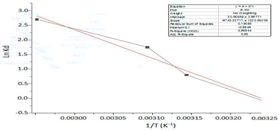 Figure 10 depicts a plot of lnKd against 1/T, from which the thermodynamic parameters (ΔH° and ΔS°) were calculated. The slope of this plot is ΔH°, and the intercept is ΔS°.