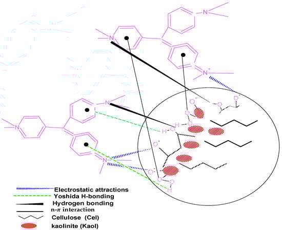 A proposed adsorption mechanism for CV by Kaol/Cel–25 is illustrated in Figure 11. The various functional groups existing on the surface of Kaol/Cel–25 participate in different interactions that facilitate the adsorption pathway of CV. Notably, the most impactful interaction is an electrostatic attraction between the CV dye molecules and the surface of the Kaol/Cel–25 adsorbent. Such an adsorption pathway encompasses the electrostatic interaction between CV dye cations and the negatively charged sites on the surface of Kaol/Cel–25. Additionally, there is the possibility of n-π interaction, which typically occurs when the lone pair electrons on an O are spread out into the orbital of an aromatic ring of dye [64]. Two kinds of hydrogen bonding take place between the Kaol/Cel–25 and the molecular structure of CV. The first and more frequent kind is dipole–dipole hydrogen bonding interaction between present O on the surface of Kaol/Cel–25 with the O and N atoms existing in the CV molecular structure. This interaction is illustrated in Figure 11. The last kind is Yoshida H-bonding, which takes place between -OH groups on the surface of Kaol/Cel–25 and the CV aromatic ring [65]. Based on the information presented above, it can be inferred that these interactions had a crucial contribution in improving the adsorption phenomenon of CV dye on the surface of Kaol/Cel–25.