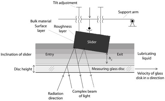 In order to carry out the tests, an optical station was built for testing sliders with a constant inclination in accordance with that used in [36]. Sliding friction is achieved by means of a glass disk rotating on a stationary inclined slider. The angle of inclination can be freely adjusted depending on the desired results. The thickness of the oil film is measured by interferometry (Figure 1). The initial reflection of the incident beam at the liquid-solid interface is supported by a sputtered chromium coating on the glass surface. When the disk rotates, the hydrodynamic effect causes the slider to lift. In the test, the number of interference fringes is identified to determine the slope. When the test equipment is turned off, the slider falls freely to the disk surface. The exact determination of the film thickness for a given reference speed, in accordance with the shift of kinematic pairs in the internal combustion engine, is based on a change in the order of the fringes and the intensity of the selected point of the interferogram during the stopping period, employing a multi-beam intensity approach [37]. In a piston-powered internal combustion engine, the average thickness of the oil film under load conditions, e.g., the expansion stroke, does not exceed 10 μm; this maximum value was adopted in the experimental studies. The average measurement error for this rig was less than 8 nm.