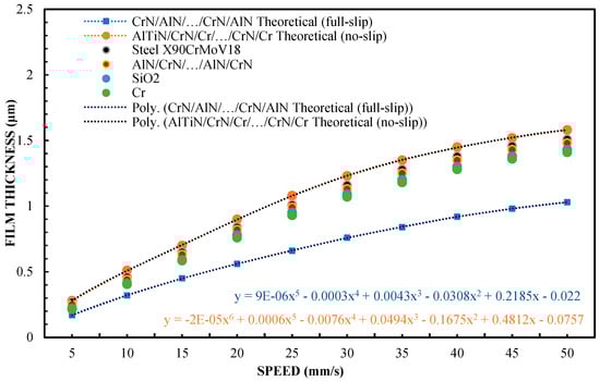 Figure 2 shows the variation of film thickness versus speed for the 65 wt % test of glycerol solution. In order to better understand the issues of hydrophilicity and hydrophobicity, two theoretical layer thickness-velocity curves were additionally plotted regarding the film thickness. In this study, also for the purposes of systematizing the results, the theoretical Reynolds equations were calculated on the basis of a full two-dimensional solution of finite differences for those surfaces covered with a lubricating film. The plotted theoretical curve read in the absence of slippage was equivalent to the classical Reynolds equation (Equation (1)). The theoretical results for full-slip conditions were calculated using the extended Reynolds equation model, with boundary conditions corresponding to a full slip, as in the case of Equation (2) [42]. Equation (2) uses the critical stress slip model. In this model, stresses of this type are assumed to be at zero. Comparing the terms of the equation on the right side of both equations, the one with the boundary conditions for a full slip (Equation (2)) was found to be only half that when using the boundary conditions without slip. As a consequence of these findings and assumptions, it can be assumed that the theoretical thickness of the layer under the boundary conditions of a full slip is smaller. The results of this finding are shown in Figure 1.