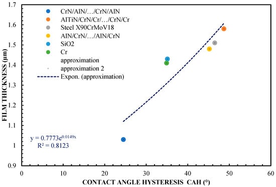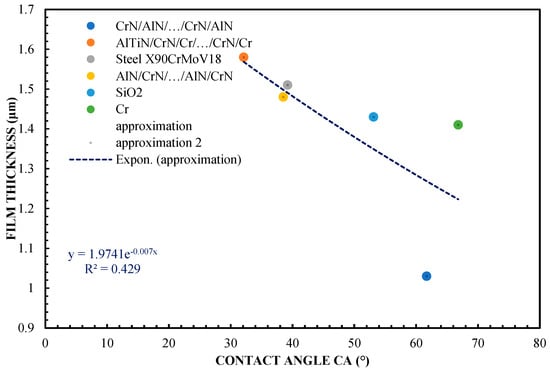 Based on Figure 4, it can be assumed that the correlation between the thickness of the lubricating film layer and CAH is much better than in the case of CA. It performs much better in terms of the predictability of the lubricating film for individual materials. CAH shows a more stable and rectilinear nature in terms of the waveform. In the case of Figure 4, slight deviations of SiO2, Cr, and CrN/AlN/…/CrN/AlN from the approximation waveform can be noticed. An additional approximation of CA was performed using a sixth-order polynomial and, in the case of CAH, using a fourth-order polynomial.