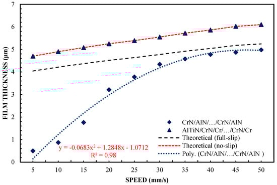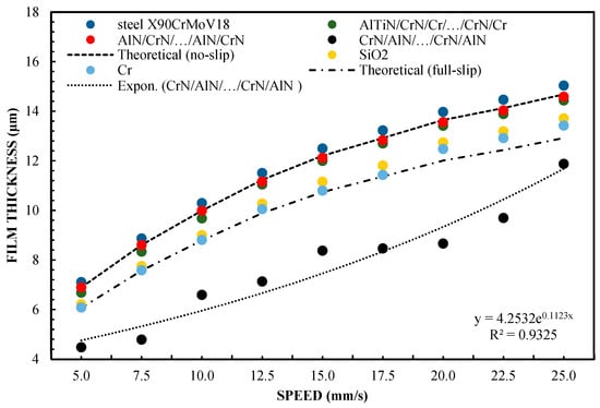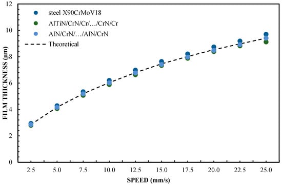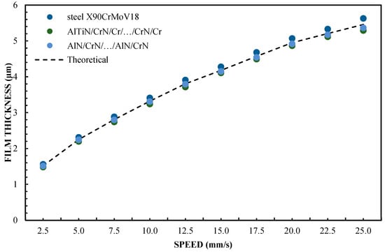 Differences between the CrN/AlN/…/CrN/AlN sliders and the AlTiN/CrN/Cr/…/CrN/Cr sliders, which represent the two extreme abilities when forming a lubricating film, are shown in Figure 5. These were verified by carrying out tests with 99 wt % of glycerin. The introduction of glycerol from 65 to 99% by weight allowed for increasing the viscosity. The test was performed at 5 and 10 N. The slope was 1:1650. The results of two different loads are shown in Figure 5 and Figure 6 for the same coatings. The measurement results, including the AlTiN/CrN/Cr/…/CrN/Cr coating thickness of the slider, are well correlated, with the theoretical anti-slip curves in the specified speed range for two loads. However, the film thickness generated by the CrN/AlN/…/CrN/AlN slider is much smaller. Due to the large measurement errors of the interference images of the CrN/AlN/…/CrN/AlN slider at low speeds, Figure 4 and Figure 5 show only the thickness of the lubricating film layer, measured at higher speeds, starting from 5 mm/s. The minimum coating thickness shown in Figure 5 and Figure 6 is still about five times greater than the roughness of the CrN/AlN/…/CrN/AlN slider that is given in Table 1. It is, therefore, assumed that there is no direct contact between the two cooperating surfaces of the selected kinematic pairs.