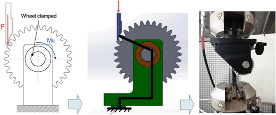 The INSTRON servo-hydraulic fatigue testing machine with maximum 100 kN loading force (INSTRON 8801, INSTRON CORPORATION, Boston, MA, USA) is utilized to test the crack propagation path of thin-rim gears. The single tooth loading condition is adopted using a dedicated device (Figure 1). The test gear is clamped on the shaft, the loading punch is fixed through two clamp parts, and a tooth of the test gear is loaded via the punch. The clamping condition of the test gear enables the reproduction of a loading condition very close to the actual working condition: the load is applied on a tooth, and it is transferred to the shaft (Figure 1).