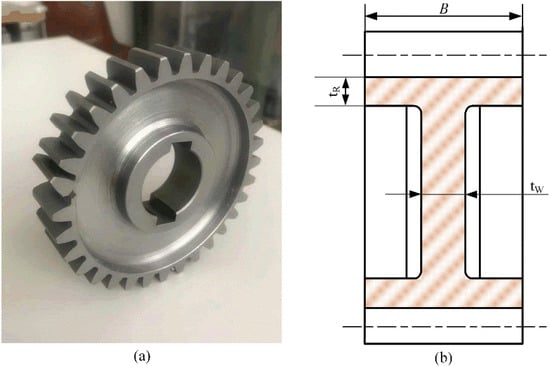 where is the rim thickness, the web thickness, b is the face width and is the normal gear modulus, as shown in Figure 2. Using this gear geometry, four configurations ( and bulk gear) are selected for simulations. The gear face width is set as a constant and .