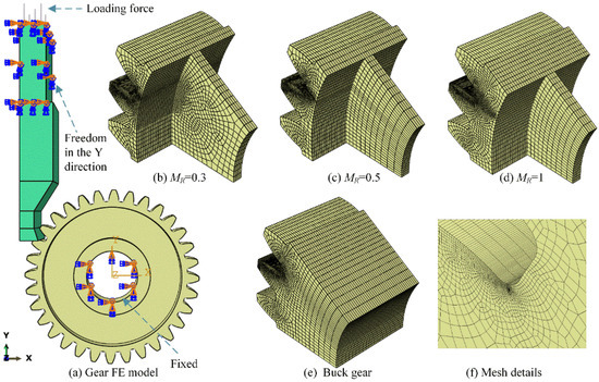 The extended finite element method coupled with commercial software ABAQUS is used to simulate the gear root crack propagation. Figure 3a shows the gear bending FE model for crack initiation position determination. The boundary conditions and loading force in the gear FE model are consistent with the experimental test for verification. The gear is fixed by a combined clamp, and the upper punch can move only along the y-axis direction. The loading force of 6000 N is applied on the upper punch and then transforms to the gear surface through the highest point of single tooth contact (HPSTC). Four types of gear with backup ratios (0.3, 0.5, 1 and buck gear) as shown in Figure 3b–e are applied to analyse the effect of rim thickness on gear root crack propagation. An 8-node hexahedron linear reduced integral element C3D8R is used on the gear and the punch parts. Figure 3f shows that a refined mesh is applied in the gear root area to achieve accurate computation. In addition, gradually rougher mesh is used to reduce the simulation time.