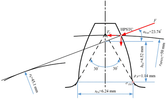 The detailed values of these geometric parameters for this gear sample are depicted in Figure 5. Accordingly, the geometry factor and stress concentration factor are , . The load force of 6000 N applied by the punch is applied on the HPSTC of the tooth surface, and the tangential load force is calculated as