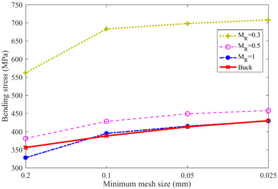 Four different element sizes (minimum mesh sizes of 0.2, 0.1, 0.05 and 0.025 mm) are used to determine the bending stress convergence. The gear bending stress is based on the international standard ISO 6336-3 [33]. Following this standard, the gear root bending stress is calculated as