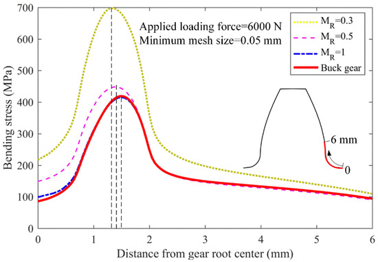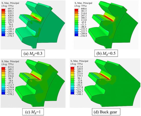 Figure 7 shows the gear bending stress distributions for different backup ratios under an element mesh size of 0.05 mm. The shapes of stress contours are similar to each other, even though the maximum gear root stress under the same loading force (F = 6000 N) is quite different due to different rim thicknesses.
