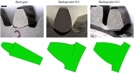 The crack propagation path is influenced by the crack initiating position. In the experimental tests, the teeth were not notched; hence, the initiation point was not forced but is in a position given by the stress state, as explained above. Figure 10 shows the experimental results obtained from the three tested wheels. The buck gear and the gear with the backup ratio MR = 0.5 show a safer crack propagation path (the cracks propagated through the tooth thickness), while a catastrophic failure (the crack propagated through the rim thickness) occurs in the wheel with the backup ratio MR = 0.3. Figure 11 shows the comparison of the gear root crack propagation paths between the experiment and simulation for different backup ratio gears. The prefabricated initiated cracks in FE simulations located in different root surfaces for different backup ratio gears are shown in Figure 9d. The simulated crack propagation paths for different backup ratio gears agree well with the experimental tests.