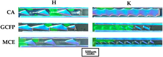 Longitudinal cross section of K- and H-type files glued with cyanoacrylate glue (CA), glass ionomer (GCFP), and composite cement (MCE). The scale bar is for all presented photos.