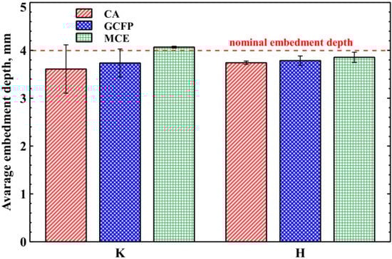 The larger the surface of the bonded joint (file-cannula), the greater the probability of clinical success. Of course, in a clinical situation, it is always necessary to carefully consider whether a larger fragment of the file can be exposed [18,19]. In the present study, two file insertion lengths, viz. 2 and 4 mm, were used for the cannula. The files were glued to the desired length (2 or 4 mm) using a special device that allowed precise insertion into the cannula. In order to check the insertion depth, a longitudinal cross section of the file-cannula set embedded in epoxy resin was made to a nominal joint length of 4 mm (Figure 3), and the depth of insertion was measured by photos of cross-sections. The mean depth of insertion of the file into the cannula was 3.76 ± 0.24 mm (Figure 3). No significant difference was found between the groups (ANOVA; p = 0.6017), confirming that the matched method and file sticking device were effective and characterized by high accuracy (Figure 4). However, it is necessary to distinguish between the depth of insertion of the file in the cannula and the true surface of the connection between the file and the cannula, which is perfectly visible in Figure 3 in the cases of K-GCFP and H-MCE.