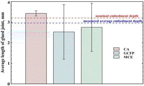 The graph (Figure 5) clearly shows that the use of the lowest viscosity adhesive (CA) results in greater repeatability of the glued joints produced. Composite (MCE) and glass-ionomer cements (GCFP) are characterized by a similar average bond length and a similar dispersion of measured values.