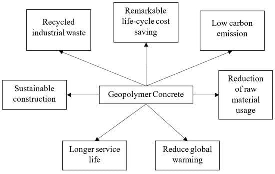 Many of the waste materials from various industrial and agricultural activities are used as precursors in geopolymer concrete. It is possible to argue that geopolymer concrete is eco-friendlier and more efficient at handling enormous amounts of waste produced by other sectors. The sustainability of geopolymers can be increased by utilizing locally accessible materials as precursors, such as laterite soil. As a result, employing geopolymers as a greener substitute for Portland cement composites would greatly cut down on raw material usage, greenhouse gas emissions, and waste management needs. The advantages of utilizing geopolymer concrete for various construction applications are presented in Figure 2.