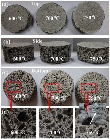 The images of sintered foams; (a) top, (b) side, and (c) bottom views, and (d) magnified images showing the cell structure at different temperatures [61].