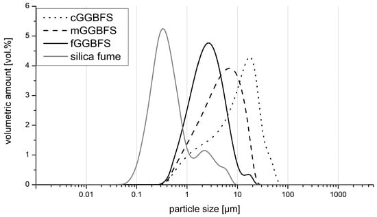 Three GGBFS with different fineness have been analyzed, namely coarse (cGGBFS), middle (mGGBFS), and fine (fGGBFS). The BET-fineness has been measured according to [76], and the Blaine-fineness according to [77]. The specific surface areas were cGGBFS: 0.6 m2/g (BET) and 3965 cm2/g (Blaine); mGGBFS: 1.3 m2/g (BET) and 7845 cm2/g (Blaine); fGGBFS: 2.0 m2/g (BET) and 12,105 cm2/g (Blaine). The silica fume had a specific surface of 18–22 m2/g (measured by BET).