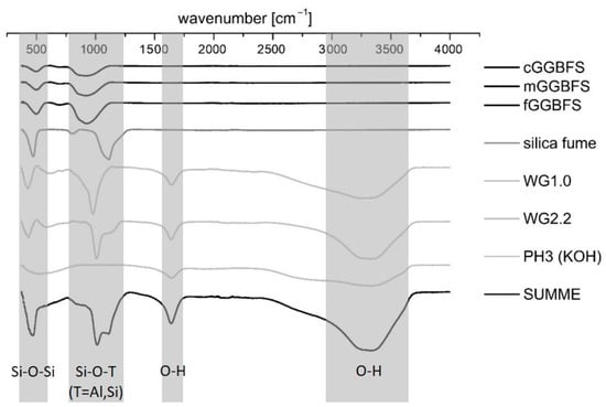 The ultrasonic velocity was monitored in situ with a type of IP-8 ultrasonic measuring system (UltraTest GmbH, Achim, Germany) and the UltraTestLab V2.0 user software. The fresh mortar was mixed with a standard hand mixer. After 60 s of mixing, the material was filled into 130-20 LIV measuring molds equipped with vibration dampers. The chosen apparatus was specially made for in situ measurements of the early setting process. The hydration kinetics was investigated by isothermal conduction calorimetry measurements using a MC-CAL/100P calorimeter (C3 Prozess- und Analysentechnik GmbH, Haar, Germany). For this purpose, all materials were stored for at least 24 h at 20 °C ± 1 °C before preparing pastes by external mixing. For that, 7.5 g of the GGBFS/silica fume binder was weighed. Subsequently, the solution was added with consideration of the solid content of the activator (see Table 3). The material was mixed for 20 s using a spatula to homogenize the mixture and shaken for another 10 s using a “Vortex” mixer before inserting the sample into the calorimeter. The investigations to predict the hydration products were carried out by means of FTIR spectroscopy because the hydrated systems in this work only showed an amorphous hydration peak in XRD (see also [57]). The FTIR–ATR data were obtained using a Bruker ALPHA-Spectrometer (Ettlingen, Germany). The wavenumber range was 500–4000 cm−1. The analysis of the spectra for the identification of the functional groups in the hardening AAM system was carried out with the software OPUS. The mixing process was analogous to the previously mentioned isothermal calorimetry. After 24 h, the hardened binder was crushed by agate mortar, and the powder was then placed in the measuring area. Figure 2 shows the spectra of the raw materials. The red curve represents the sum of the given curves. As expected, the GGBFS samples differ only in the peak height and not in the peak location. The potassium water glasses show minor deviations in the maximum peak in the fingerprint region < 1500 cm−1, which is 1008 cm−1 for WG2.2 and 977 cm−1 for WG1.0. The OH bonds of the aqueous solutions are clearly visible at a wavenumber of 1600 cm−1 and approx. 3300 cm−1. For simplicity, only PH3 has been shown in the diagram as potassium hydroxide (KOH). In the course of the studies, only the strain vibrations of Si-O-T units were observed. These are characteristic of the formation of the reaction products. As stated in the literature part, in Portland cement and AAM systems, the Si-O-T stretch belts of the C-(A)-S-H phases can be found at a wavenumber in the range of 900–1000 cm−1 [65,66,67,68,69,89,90].
