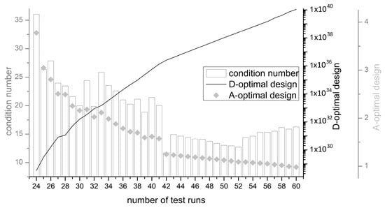 D- and A-Optimality values as well as the condition number in dependency of the number of test runs.