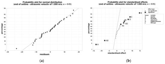 In order to be able to make a statement about the influence of various varied parameters on the curing behavior, the results of the ultrasonic test were evaluated with the statistical software Minitab®. Figure 4a shows the probability plot for normal distribution, and Figure 4b the probability plot for standardized effects for the time point mentioned. All individual values are listed in Appendix A. The two-sided confidence level was set at 95% for all intervals. The time at which the ultrasonic velocity through the blends is 1000 m/s was determined. This time also correlated with the end of setting of the blends.