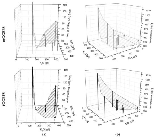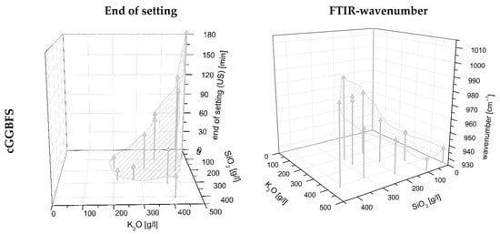Since the activator has the most significant influence on the position of the FTIR peak, Figure 5b shows the wavenumbers as a function of the amount of K2O and SiO2 in the activator. The shift of the peak in the range 900–1000 cm−1 to a smaller wavenumber with increasing K2O content in the activator is evident. In addition, it can be seen that for the samples using finer slags, mGGBFS and fGGBFS, the wavenumber of the respective maximum peak is, on average, at a lower level compared to the peaks for the blends using cGGBFS. The measured IR spectrum of AAM systems always represents a total of unhydrated GGBFS and the reaction products. For the analysis of the hydration process, the peak position and the shift over time are of particular interest.