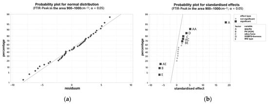 Probability plot for: (a) normal distribution for the FTIR peak in the area 900–1000 cm−1; (b) standardized effects for the FTIR peak in the area 900–1000 cm−1.