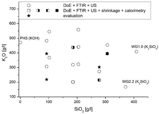 Therefore, the curing behavior is significantly dependent on the used PH type, the WG type, as well as their combination. That means that the K2O/SiO2 ratio and the respective amount are the major levers to adjust curing behavior. In addition, the interactions of the factors mentioned must be considered significant. Furthermore, the grinding fineness of the GGBFS is important for the curing time, but to a minor extent. In Figure 5a, it can be seen that the end of setting (measured by ultrasonic test (US)) decreases with increasing SiO2 content, thus increasing silica modulus. Some of the samples solidified after less than 10 min. In the case of a too high silica modulus, the samples did not solidify. As expected, increasing the fineness of the GGBFS leads to an acceleration of the reaction (linear influence).