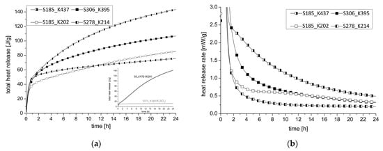 The heat of hydration in a period of 24 h is shown in Figure 8. Figure 8a shows in the below right the hydration curves for blends activated exclusively with a SiO2-rich activator WG2.2 (S371_K169) and exclusively with a K2O activator PH3 (S0_K470). It is noticeable that the use of WG2.2 is immediately followed by a plateau after a small initial increase of heat release. The material was still not solid after 24 h. When PH2 is chosen as activator, a steady, almost linear increase over 24 h can be seen. By combining the two solutions, a clear acceleration of the hydration and a clear increase of the initial period in the first 10 min of hydration can be measured. The samples with a comparatively high potassium hydroxide solution as activator show a clear increase even after approx. 1 h. It is obvious that a high SiO2 content in the activator weakens the post-hardening.