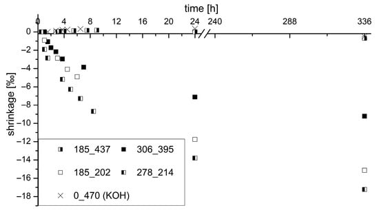 A Quanta FEG 250 environmental scanning electron microscope (ESEM; FEI, Hillsboro, OR, USA) was used for the scanning electron examinations. For the microscopic examinations, sections of the samples to be analyzed were prepared and carried out in low-vacuum mode using water vapor as ambient gas. To check the shrinkage deformation, shrinkage prisms were examined in accordance with [91]. Contrary to the dimensions in the DIN standard, smaller shrinkage prisms with dimensions of 2 × 2 × 11 cm3 were produced for the tests to handle the faster setting time. Most of the shrinkage tests performed on AAM were carried out by producing and measuring shrinkage prisms with higher dimensions. Therefore, the samples were stored in the formwork for a defined period of time (usually 24 h) before they were demolded, and a zero value was determined [29,33,92]. During the first 24 h of hydration, however, the major change in shape already occurs. Consequently, in this study, samples have been deformed and measured for zero value directly after hardened. Shrinkage cracks start and occur in the hardened state when no more deformations can be absorbed. Finally, the investigations to measure the pore sizes were carried out in accordance with [93] with a Poremaster from Quantachrome (Boynton Beach, FL, USA). The samples were measured after 24 h in fragments up to 5 mm.