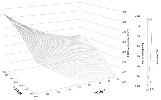 The DoE studies have shown that the setting and hydration mechanism of GGBFS/silica fume blends depend significantly on the choice of activator. The development of the FTIR peak is significantly influenced by the activator composition. It is known that the main FTIR peak consists of the overlap of different peaks [57]. The correct analysis of the deconvolution of the peaks and the comparative analysis depends on them. However, the location of the main FTIR peak allows an estimation of the cross-linking of the silica gel, which, in turn, has been shown to determine the properties of the hardening material.