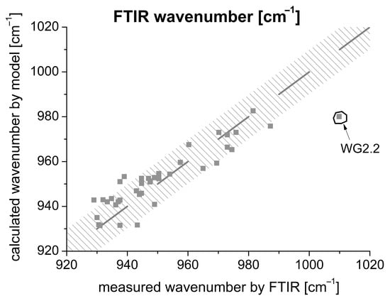 Two samples showed a gel-like structure and an ultrasonic velocity of <500 m/s even after 24 h and were, therefore, not considered further. Both samples have been activated solely with the WG2.2. Otherwise, an evaluation would not be possible and would lead to false results with a low R2. With the modification, an R2 of 97.73% can be set.