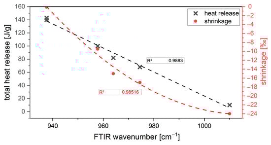 Various methods are used to predict the properties of alkali-activated materials. Multi-factor statistical methods were the choice of various studies in this context. A single-factor method used in other relevant studies cannot reflect the interaction between different factors. Thus, response surface models (RSM) were often chosen to predict and evaluate strength trends [72,73]. In these studies, the prediction models were always based on the activator composition in terms of the modulus of the activator, the choice of activator, and the content of binder. In the correlations, good coefficients of determination of AAM systems between different parameter and composition could be found, which proves that the prediction model has high prediction accuracy and good validity. Subsequently, analytical methods such as FTIR values are mostly used as an evaluation to correlate the properties [74]. From these studies, it can be concluded that FTIR can be directly correlated (without any intermediate step) with the properties of AAM. Moreover, various authors attempted to develop a regression model for shrinkage as a function of composition and explained the shrinkage as a function of the chain lengths of the hydration products and their ion incorporation, which they correlated by FTIR. Good agreement was demonstrated with FTIR [74]. In addition, it was found that more properties from the early reaction process can be described by ultrasound and combined to FTIR results for high accuracy [75]. The aim of this study is to develop a model based on the FTIR method for the efficient prediction of fast-hardening alkali-activated slag/silica fume blended pastes. In this work, it is also shown that further properties of these binders can be directly and accurately estimated from the model. Significantly, the knowledge of the FTIR main peak in the area of 900–1000 cm−1 can be used to predict shrinkage and curing behavior depending on the activator used.