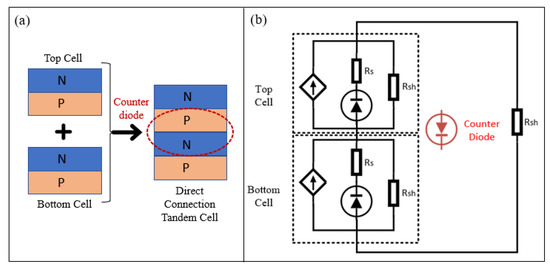 A tandem configuration device can be developed as a two-terminal (2T) (monolithic) or four-terminal (4T) (mechanically stacked) device. Two cells are optically and electrically connected in a 2T device. This connection reduces the expense of one or more transparent electrodes, by sharing the intermediate electrode. According to reports, a 2T tandem structure has stronger light coupling and less optical loss between the two sub-cells than a 4T device [6,7]. A 2T monolithic perovskite/silicon (PSC/Si) tandem device recorded high efficiency of 29.15% [8], compared to the 28.2% [9] in the 4T device. As reported by Ruhle, the detailed balance limits of 2T and 4T PSC/Si devices are 41.6% and 43.7%, respectively, considering a top band gap PSC cell of 1.55 eV [10]. The total current density (Jsc) flowing in the tandem device is determined by the lowest short circuit current (Jsc) output from any of the sub-cells, where the open circuit voltage (Voc) for tandem is the sum of the Voc of the sub-cells.