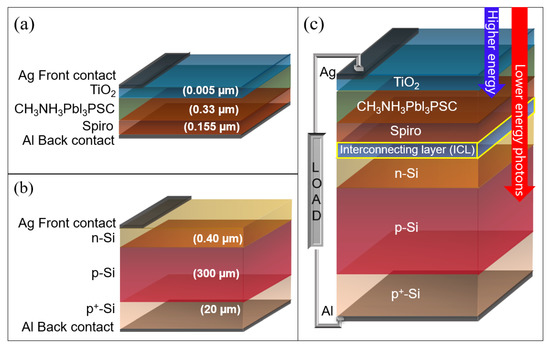 (a) perovskite solar cell, (b) silicon solar cell, and (c) tandem 2T PSC/Si solar cell.