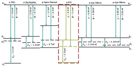 A band diagram of the materials utilized in this work is shown in Figure 3, which included n-TiO2, intrinsic i-CH3NH3PbI3 perovskite, p-Spiro-Ometad, interconnecting layer (ICL), n-type and p-type silicon.