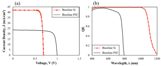 (a) J-V curve, and (b) QE comparison between the baseline Si and PSC devices.