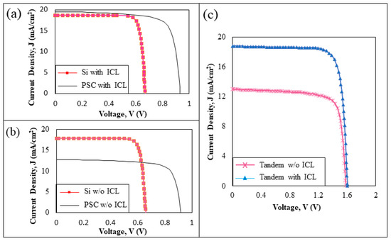 Figure 5a,b compare the individual characteristics of Si and PSC, configured with and without ICL layers. Not much difference was found in terms of Voc for both devices in both tandem configurations, but a Jsc reduction can be observed compared to its single junction cell performance. The tandem design of Si and PSC with no ICL resulted in 17.83 mA/cm2 and 12.74 mA/cm2 photocurrents, respectively. An improvement in Jsc performance for both the Si and PSC tandem design resulted from using the ICL layer, where the devices recorded 18.65 mA/cm2 and 19.51 mA/cm2, respectively. Clear effects of the ICL on the total Jsc performance are depicted in Figure 5c, where the tandem device with ICL recorded a current matching at 18.77 mA/cm2; however, only 13.01mA/cm2 was found for the non-ICL tandem device. The optimized Voc for both tandem structures, with and without ICL, was maintained at 1.6 V. Based on these results, we can conclude that the total Jsc in a tandem device is equivalent to the lowest Jsc that flows through either one of the sub-cells, to ensure current matching; and Voc, on the other hand, is the sum of the two sub-cells.
