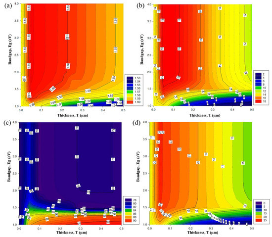 Subsequently, to minimize the parasitic absorption and recombination, the ideal bandgap and thickness of the possible candidates for the ICL were explored for the modeled two-terminal tandem structures. The electrical performance of the device is shown in Figure 6, while adjusting the thickness (T) and bandgap (Eg) of the interconnecting layer, to acquire the optimized properties for the ICL material.