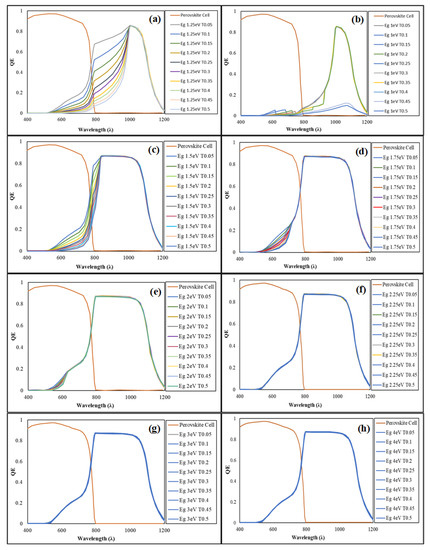 In a tandem configuration, the wide-bandgap material captures photons with higher energies, while the remaining photons with lower energies traverse the top cell and are absorbed by the rear sub-cell [34]. Figure 7 represents the ICL influence on the total absorption spectrum, based on the bandgap energy specified and the thickness of the proposed ICL material. The influence of ICL thickness variations is significant at 1 < Eg < 2 eV and is negligible for Eg ≥ 2.25 eV. An ICL with a low bandgap tends to absorb part of the spectrum, before the high wavelength photons are transmitted to the rear cell, as shown in the trend observed in Figure 7a–e. QE trends are constant for Eg ≥ 2.25 eV, where PSC and Si absorb lower and higher wavelength photons, respectively, reducing the thermalization loss. Here, a thickness of 50 nm, resulting from the analysis in Figure 7 with Eg ≥ 2.25 eV, can be specified as the optimum characteristic for any potential ICL material for use in a PSC/Si tandem setup.