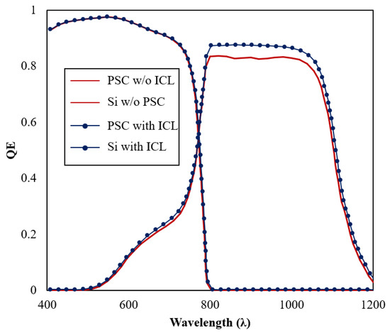 QE spectra of Si and PSC sub-cells of the proposed tandem configuration.