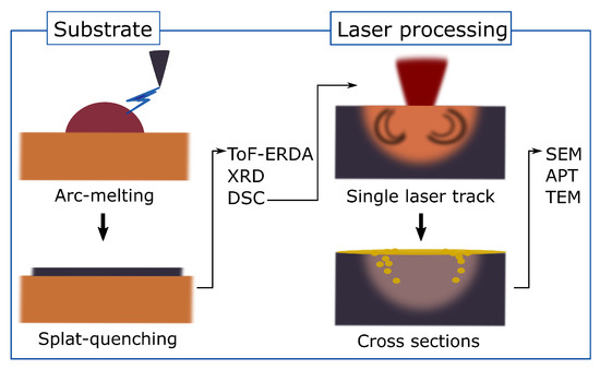 21]. As such substrates are not commercially available, they were fabricated by the arc melting of the desired composition and subsequent splat quenching to obtain an amorphous substrate. Laser tracks were then written on the surface of these substrate sheets. The process steps and characterisation techniques are summarised in