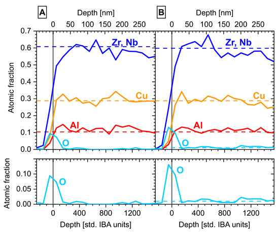 Figure 2). The oxygen level of both substrates was about 0.3 at.% higher (excluding the surface) than the nominal compositions, thus likely reflecting the impurity contribution due to arc melting and splat quenching, in addition to the impurity concentration of the raw materials. The surface shows a clear oxygen-rich layer with the signal peak centered around zero depth. The statistical errors of the ToF-ERDA results for (Zr+Nb), Cu, and Al were ±0.7 at.%, 0.5 at.%, and 0.4 at.%, respectively, indicating that the remaining discrepancies around 1 at.% likely originate from the manual weighing in of the individual materials. For oxygen, the statistical error was ±0.1 at.%. The depth profile in nm was calculated using the reported density of 6.64 g/cm
