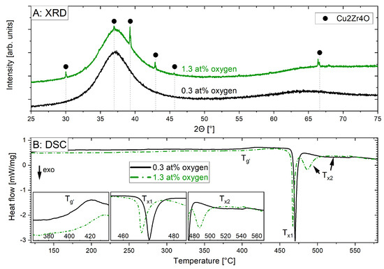 Figure 3. The substrate with 0.3 at.% oxygen was X-ray amorphous, while the substrate with 1.3 at.% oxygen showed a small crystalline fraction. This indicates that the cooling rate of the splat-quenching process was no longer sufficient to avoid crystallisation when oxygen was added intentionally, which highlights the crucial role of comparatively small oxygen concentrations. The observed peaks in the XRD pattern can be attributed to Cu