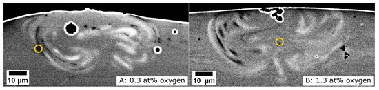 28]. The extent of the melt pool is semicircular, without indications of keyhole formation, and only ∼33% larger than the laser beam diameter at the focus (40 µm). The black areas surrounded by intense white halos are not features of the track. The image of the sample with 0.3 at.% oxygen (A) exhibits three circular shapes that probably originate from contamination on the polished surface, while the shape in the image of the laser-processed sample with 1.3 at.% oxygen (B) is a crack on the surface of the track, into which the moulding compound flowed during embedding. The melt pool geometry exhibits a distinct flow pattern. The chemical contrast image is consistent with convective flow within the melt pool during laser processing. The light contrast appears very similar to the observations made by Lindwall et al. [