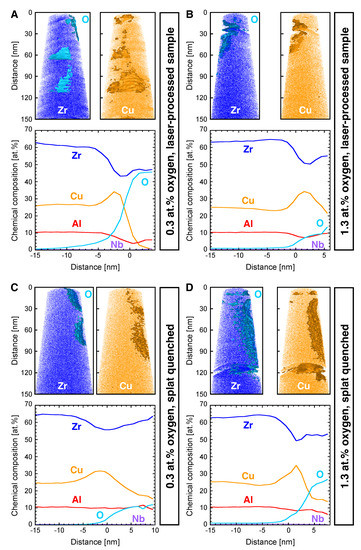 Figure 5, oxygen isoconcentration surfaces highlight the elemental distribution around oxygen-rich nanoparticles. Here, Zr is depleted at the interface compared to the nanoparticles and matrix, while Cu is enriched at the interface. The observed different oxygen levels from the nanoparticles do not necessary reflect a chemical difference but could result from the geometrical fraction of the individual nanoparticles incorporated into the tip. Since oxygen-rich regions can be observed in the specimens from the melt pools (laser-processed samples) as well as 0.5 mm away from the laser tracks (untreated samples), it can be concluded that the incorporation of these impurities takes place irrespective of the laser processing. From the data presented in