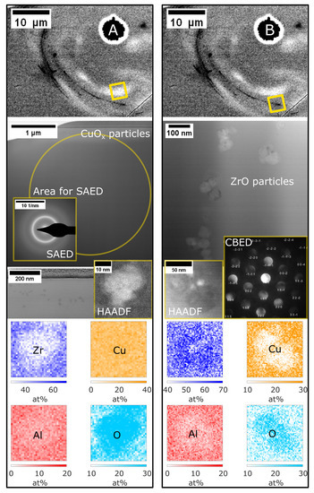 Transmission electron microscopy (TEM) with energy dispersive X-ray spectroscopy (Titan Themis with SuperX EDS, FEI, Hillsboro, OR, USA) was employed to analyse a lamella prepared by FIB milling from the cross-section of the laser-processed sample with 0.3 at.% oxygen. In addition to the chemical information, structural information was gathered with selected area electron diffraction (SAED) and convergent beam electron diffraction (CBED).