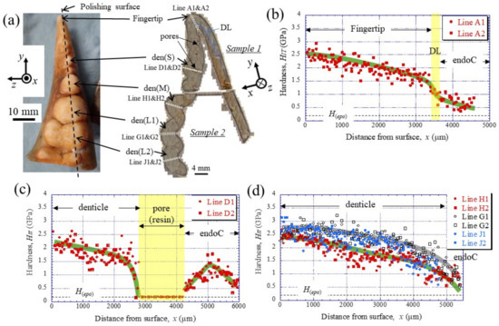 (a) Appearance of the fixed finger after cutting and cross-sectional micrographs after polishing. Distributions of hardness, HIT, with distance from the outer surface, x, on (b) Line A (fingertip), (c) Line D (small denticle), and (d) Line H (medium denticle) and Lines G and J (large denticles) in the claw cross-section, obtained via nanoindentation tests. Here, H(epo) denotes the hardness of the cold epoxy resin, DL denotes the discoloration line, and endoC denotes the endocuticle.