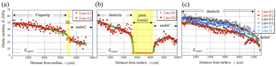 To clarify the denticle size dependence on hardness, the change in mechanical properties, HIT and Er, along the thickness from the outer surface to the inner surface on the pinching side, was investigated through nanoindentation testing. Figure 3c,d shows the distribution of HIT along lines D1, D2 (small denticle), lines H1, H2 (medium denticle), and lines G1, G2 and J1, J2 (large denticles). For comparison, the results for lines A1 and A2 of the fingertip are shown in Figure 3b. Here, the two lines are parallel and separated by more than 50 μm at each thickness. In the fingertip (Figure 3b), the HIT gradually decreased from 2.5 GPa, decreased abruptly at the discoloration line (DL), and then gradually decreased again. The HIT in the small denticle (Figure 3c) decreased gradually from 2–2.5 GPa and then decreased abruptly as it approached the pore. In the medium and large denticles (Figure 3d), the HIT gradually decreased until the inner surface, like the changes, until the DL of the fingertip. The HIT of the two large denticles (lines G1, G2, and J1, J2) was almost the same and larger than that of the medium denticle (lines H1, H2). The results for the Er, which showed changes similar to those for the HIT, are summarized in Figure 4.