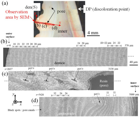 Figure 6 and Figure 7 show SEM micrographs near the outer surface, middle, and inner surface on Line D (small denticle, den(S)) and Line G (large denticle, den(L1)), shown in Figure 2. On Line D in Figure 6, the whole part of the exoskeleton with a 5880 μm thickness is striated parallel to the stacking height (Sh) of the TPS, and the Sh gradually decreases as it approaches the outer and inner surfaces. In particular, the Sh near the inner surface is very low, 11 μm or less. The Sh near the outer surface is 18–24 μm. Some pore-canal tubes (pcts)//x perpendicular to the outer surface were clearly observed near the pore filled with resin. The black spots in the endoC near the inner surface indicate pore canals (pcs). These black spots were also observed on the endoC on the outer side of the claw finger in the previous paper [14] and often can be observed on the polished surface of the exoskeleton with a TPS in crustaceans [1,18,20,23,26]. On the other hand, in Line G, shown in Figure 7, since the large denticle surface had a dense tissue structure, it was not possible to clearly observe the microstructure. The microstructures are visible from the middle to the inner surface and were striated with the Sh (18–20 µm) of the TPS, similar to Line D. Furthermore, many black spots were observed at the endoC near the inner surface.