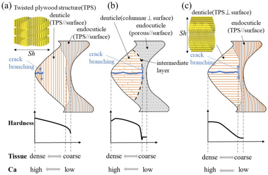 On the other hand, for the mud crab, losing a denticle is directly related to not being able to crush a staple food. Therefore, in the exoskeleton of the pinching side with large denticles, there was almost no endoC (Figure 2), and no rapid decrease in hardness was observed in the intermediate layer (Figure 3b–d). In addition, since the structure of the denticle was a twisted–plywood pattern stacked parallel to the surface, it was tough, making it difficult for cracks to propagate inside, as shown in Figure 8a. In short, the denticles of the mud crab have a tissue structure that is never lost if they crack while pinching. Such a structure has also been observed in the tissue structure of hypermineralized hammer-like dactyl clubs, a weapon for crushing prey [29].